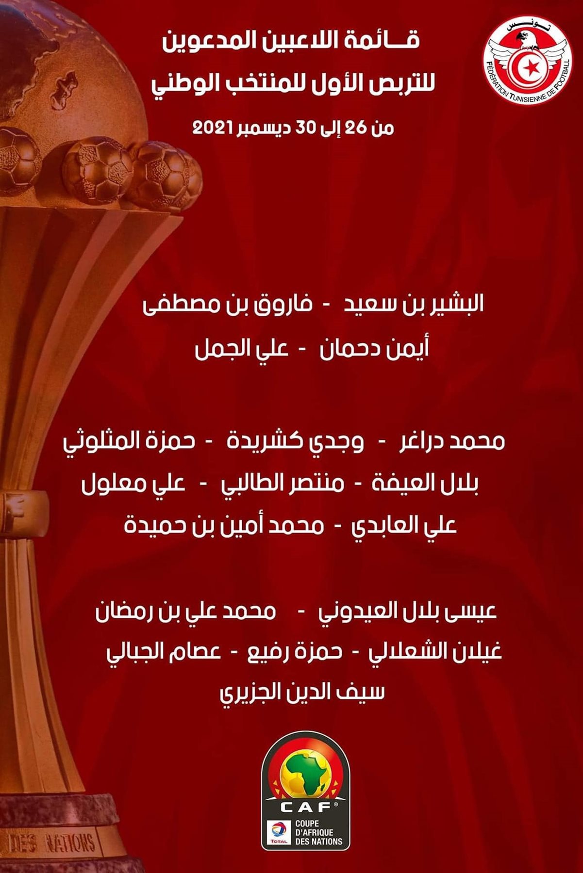 ومن المقرر أن ينتظم اللاعبون المختارون في القائمة في معسكر مع المنتخب التونسي خلال الفترة ما بين 26 وحتى 30 ديسمبر الجاري، على أن يعلن المدرب منذر الكبير في نهاية المعسكر أسماء 10 لاعبين إضافيين يستكمل بهم تشكيل القائمة النهائية لنسور قرطاج استعدادًا لبطولة كأس أمم إفريقيا.