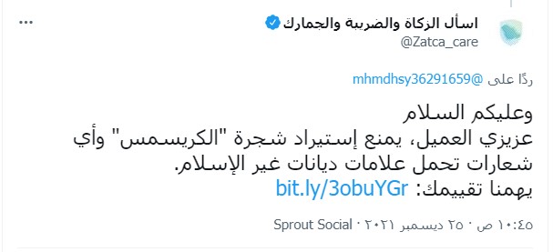 وقالت هيئة الزكاة والضريبة والجمارك السعودية في رد لها على تساؤل حول شرعية استيراد شجرة الكريسماس تزامنًا مع احتفالات أعياد الميلاد، إنه يمنع استيراد شجرة الكريسماس بشكل نهائي.