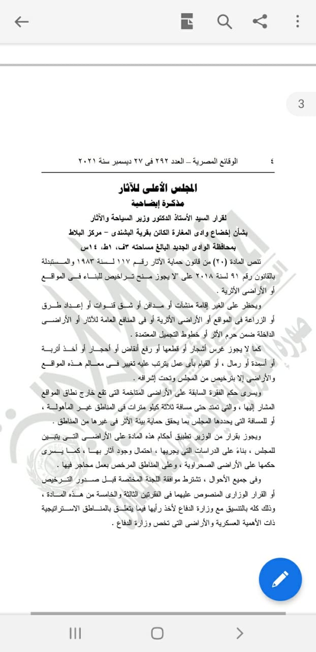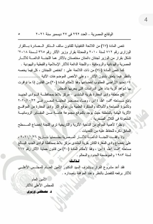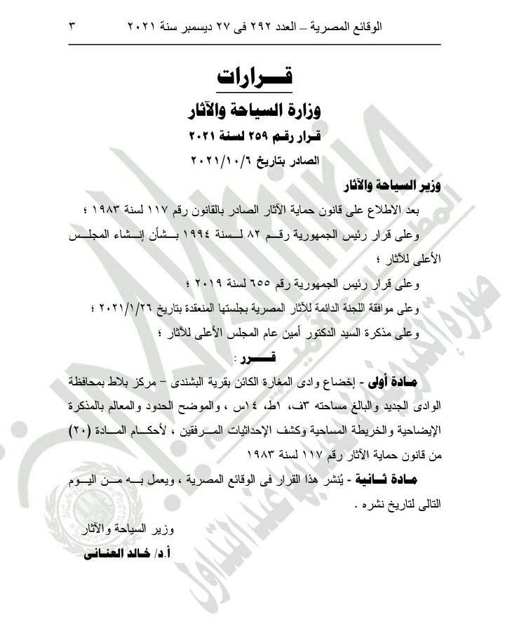 نشرت الجريدة الرسمية في عددها الصادر اليوم الأحد، قرار الدكتور خالد العناني وزير السياحة والآثار، رقم 259 لسنة 2021، والذي ينص على إخضاع منطقة وادي المغارة بقرية البشندي التابعة لمركز بلاط بمحافظة الوادي الجديد، لقانون حماية الآثار.
