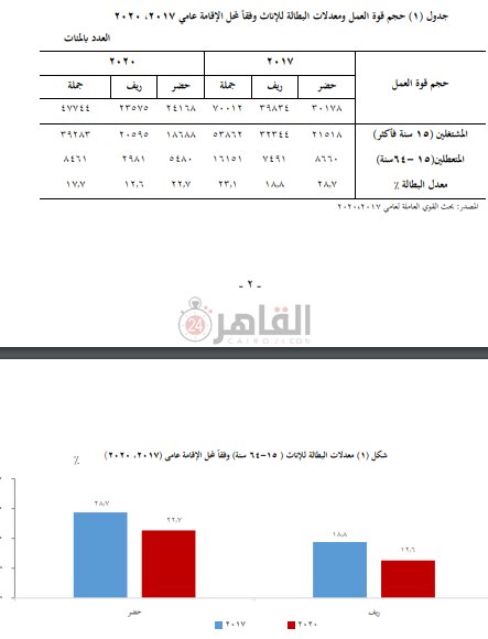 كشفت دراسة صادرة عن الجهاز المركزي للتعبئة العامة والإحصاء أن قوة العمل للإناث لـ الأعمار من 15 إلى 64 سنة وفقا لمحل الإقامة، انخفضت حيث بلغت 4.8 مليون نسمة عام 2020، مقابل 7 ملايين نسمة عام 2017.
