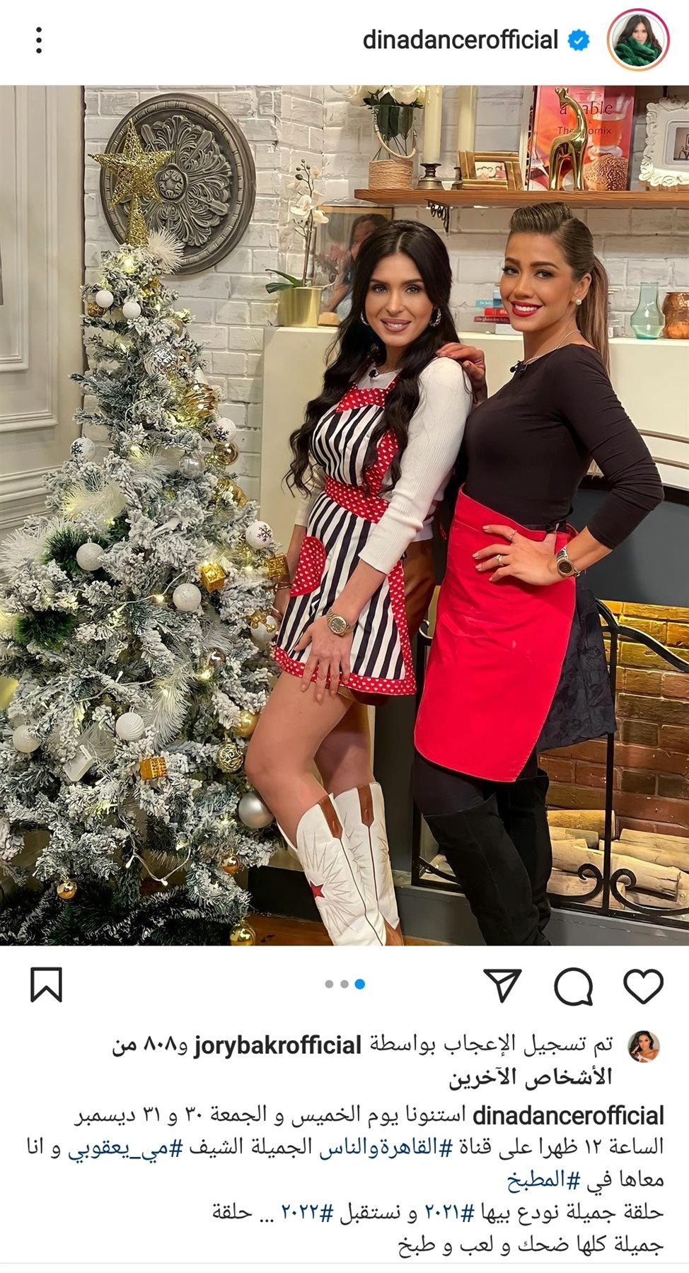وتابعت الراقصة دينا: الجميلة الشيف مي يعقوبي وأنا في المطبخ، حلقة جميلة نودع بيها 2021، ونستقبل 2022.. حلقة جميلة كلها ضحك ولعب وطبخ.