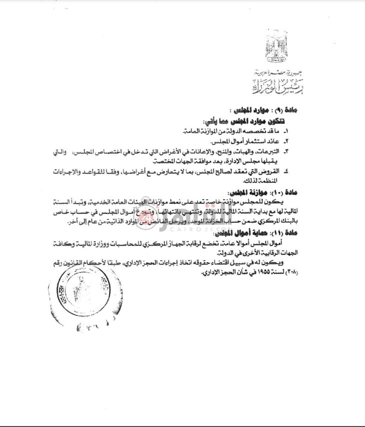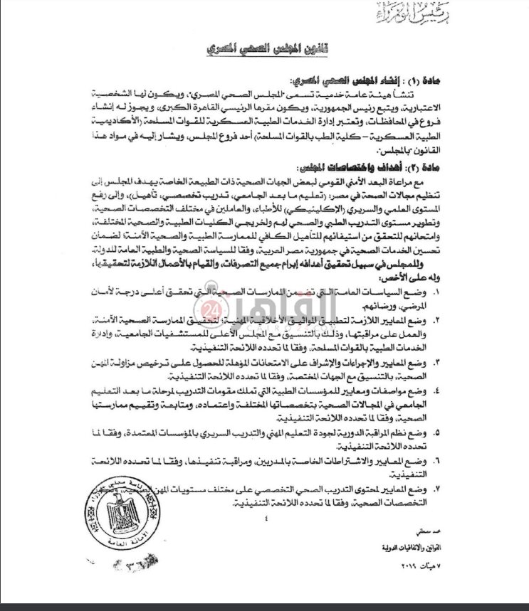 وانتظم مشروع قانون المجلس الصحي المصري، الذي انفرد بنشره القاهرة 24، في 5 مواد أساسية، حيث أقرت المادة الأولى بأن تنشأ هيئة عامة خدمية تسمى المجلس الصحي المصري، ويكون لها الشخصية الاعتبارية، ويتبع رئيس الجمهورية، ويكون مقرها الرئيسي القاهرة الكبرى، ويجوز له إنشاء فروع في المحافظات، وتعتبر إدارة الخدمات الطبية العسكرية للقوات المسلحة والأكاديمية الطبية العسكرية - كلية الطب بالقوات المسلحة أحد فروع المجلس، ويشار إليه في مواد هذا القانون بالمجلس.