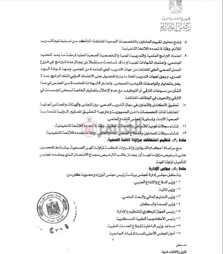 9- اعتماد البرامج العلمية والتدريبية المهنية والتخصصية الصحية العليا لمرحلة ما بعد التعليم الجامعي، واعتماد الشهادات المهنية أو ما قد تستحدث مستقبلا لن يجتاز هذه البرامج في فروع العمل الصحي العلبي المختلفة من جهات التدريب المهني المعتمدة من المجلس، ومنها شهادة البورد المصري، ويحق لجهات التدريب اتخاذ ما يلزم للحصول على الاعتماد الدولي لتلك البرامج، بما يخل بالمعايير والمواصفات القياسية للمجلس، وتعتبر الشهادات المعتمدة من المجلس في هذا الشأن من مسوغات الترقي أو التوظيف، مع عدم الإخلال بالمعايير الخاصة لبعض المؤسسات في الترقي والتعيين في الوظائف المختلفة.