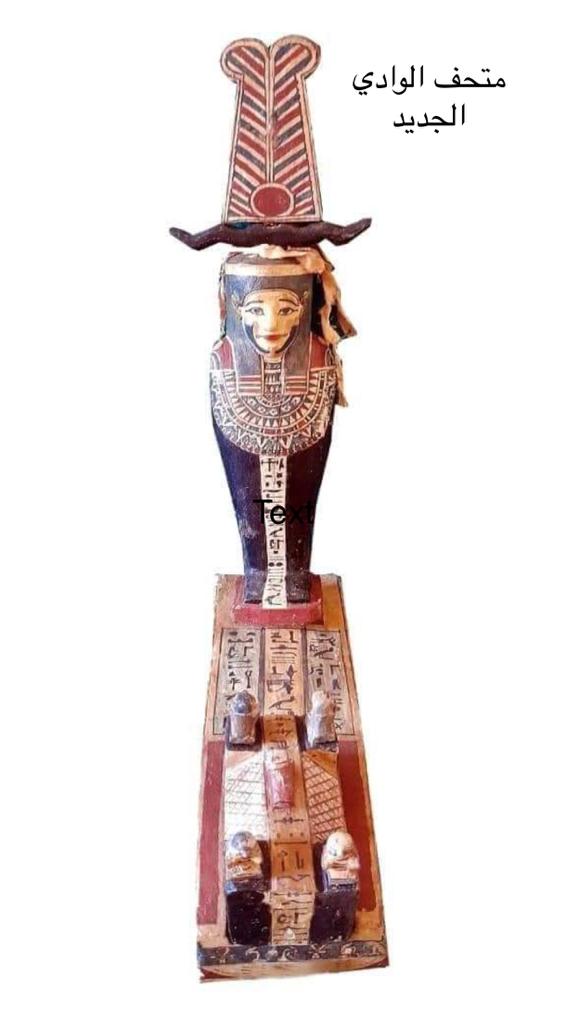 متحف آثار الوادي الجديد: يعرض تمثال مصنوع من الخشب، من العصر اليوناني الروماني يصور الإله أوزوريس يحمل فوق رأسه تاج عبارة عن ريشتين وقرني بقرة.