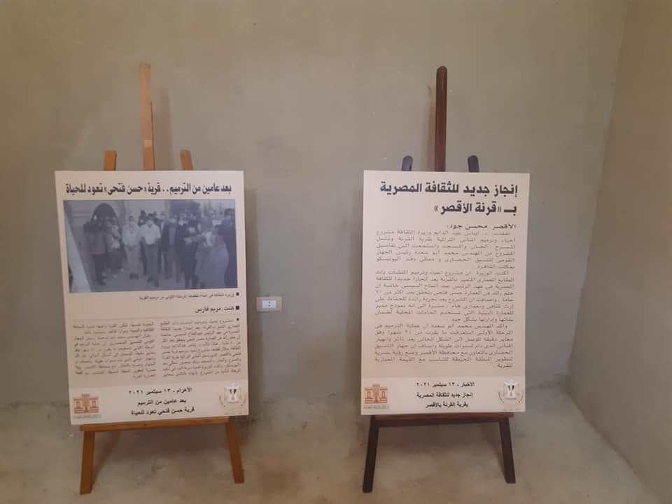 ويضم المعرض عددا من الصور والوثائق النادرة من بينها: قرار انتداب المهندس حسن فتحي لمصلحة الآثار والإشراف الكلي على مشروع القرية النموذجية بالقرنة في 5 يوليو 1949، وقرارات تعيين عدد من الكوادر للعمل في المشروع ومن بين تلك القرارات قرار الاستعانة بالمهندسين المعماريين من خريجي مدرسة الفنون الجميلة العليا للعمل بالمشروع وتعود تلك القرارات إلى عام 1947.
