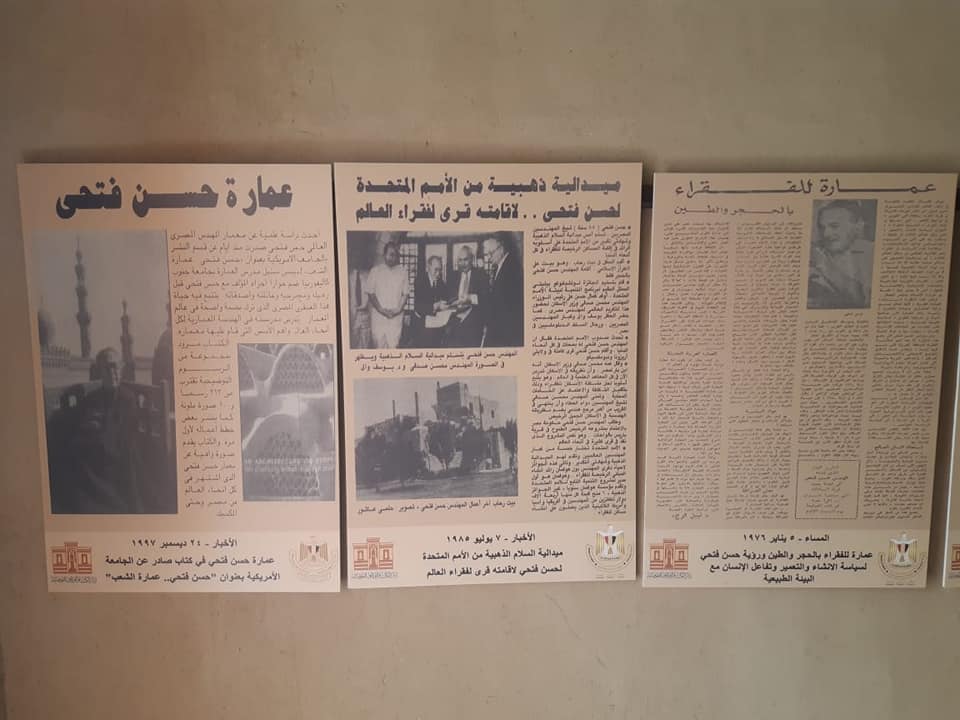 يحتوي المعرض أيضا حوارات صحفية مع المعماري الكبير وعددا من التحقيقات الصحفية حول القرية، بالإضافة إلى صور من حفل تكريم حسن فتحي في منظمة الأمم المتحدة، ومن بين المعروضات صورة مكبرة لطابع بريد تذكاري صدر في عام 1994 بمناسبة مرور خمس سنوات على وفاة حسن فتحي.