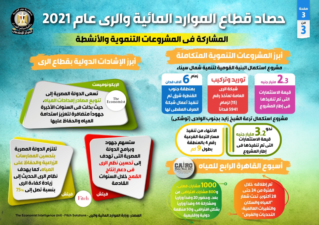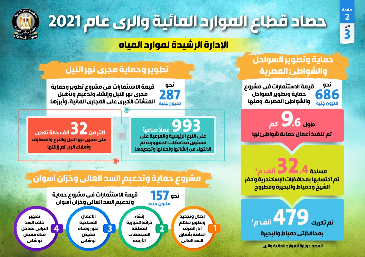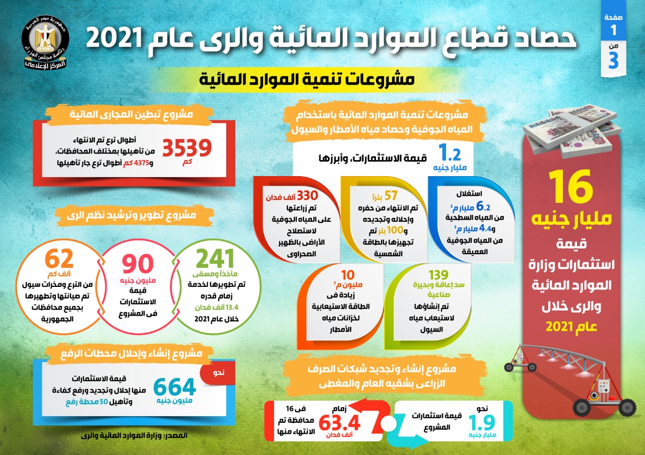 نشرت وزارة الري والموارد المائية، انفوجرافات عن حصاد عام 2021، بالنسبة لمشروعات تنمية الموارد المائية ومجهودات الوزارة فيما يتعلق بالإدارة الرشيدة لموارد المياه.