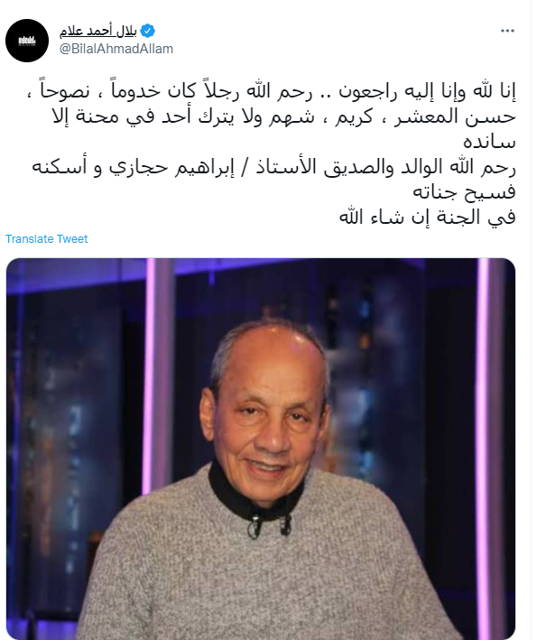 ونشر بلال أحمد علام، المعلق الرياضي تغريدة تقول: رحم الله رجلًا كان خدومًا، نصوحًا، حسن المعشر، كريما، شهما، لا يترك أحدا في محنة إلا سانده.. رحم الله الوالد والصديق الأستاذ إبراهيم حجازي وأسكنه فسيح جناته.. في الجنة إن شاء الله.