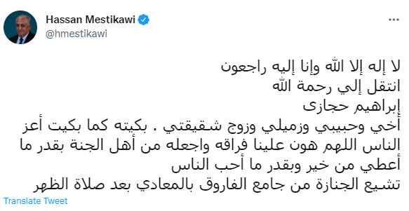 وكتب حسن المستكاوي الناقد الرياضي عبر حسابه: انتقل إلى رحمة الله إبراهيم حجازي أخي وحبيبي وزميلي وزوج شقيقتي، بكيته كما بكيت أعز الناس، اللهم هوِّن علينا فراقه واجعله من أهل الجنة بقدر ما أعطى من خير وبقدر ما أحب الناس.