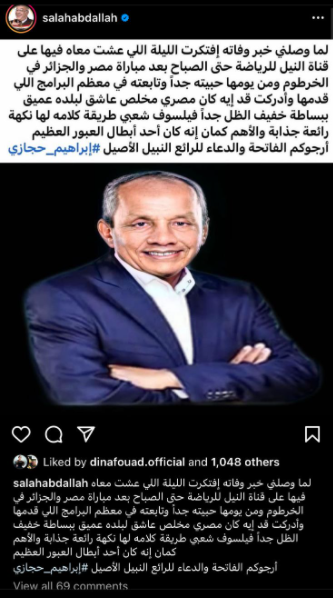 ونشر صلاح عبدالله، صورة للكاتب إبراهيم حجازي، عبر حسابه الشخصي بموقع تبادل الصور والفيديوهات القصيرة انستجرام، وقال:لما وصلني خبر وفاته إفتكرت الليلة اللي عشت معاه فيها على قناة النيل للرياضة حتى الصباح بعد مباراة مصر والجزائر في الخرطوم ومن يومها حبيته جدًا وتابعته في معظم البرامج اللي قدمها.