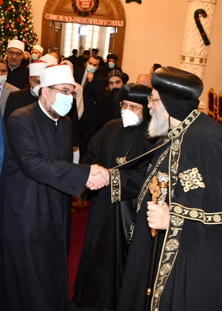 في سياق آخر، توجه الدكتور شوقي علام، مفتي الجمهورية، رئيس الأمانة العامة لدُور وهيئات الإفتاء في العالم- صباح اليوم إلى المقر البابوي بالكاتدرائية المرقسية بالعباسية لتهنئة قداسة البابا تواضروس الثاني بحلول عيد الميلاد المجيد.