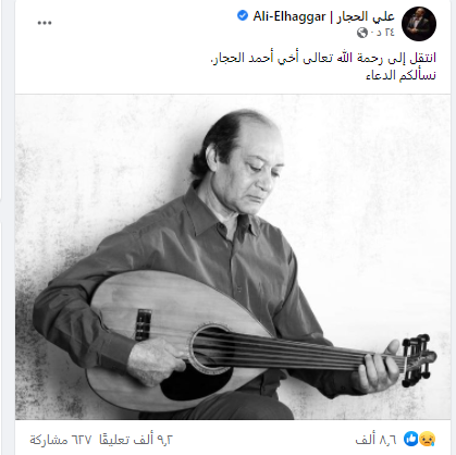 وكتب علي الحجار عبر صفحته الرسمية بموقع فيس بوك: انتقل إلى رحمة الله تعالى أخي أحمد الحجار، نسألكم الدعاء.