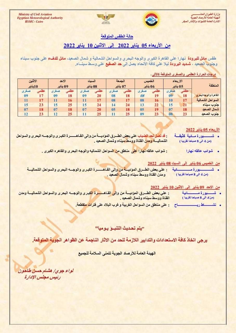وقالت هيئة الأرصاد في نشرتها الأسبوعية؛ التي تعلن من خلالها تفاصيل الحالة الجوية في البلاد، إنه يسود خلال هذا الأسبوع وحتى منتصف الأسبوع المقبل؛ طقس مائل للبرودة نهارا على القاهرة الكبرى والوجه البحري والسواحل الشمالية وشمال الصعيد، مائل للدفء على جنوب سيناء وجنوب الصعيد، نهارًا.