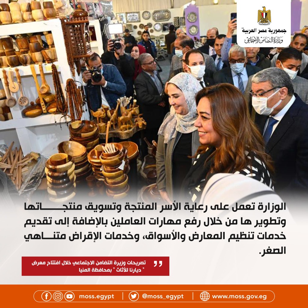افتتحت نيفين القباج وزيرة التضامن الاجتماعي، الأحد الماضي، معرض ديارنا للأثاث والحرف اليدوية لمستلزمات المنزل في محافظة المنيا، والذي تستمر فعالياته على مدار أسبوعين، بحضور اللواء أسامة القاضي محافظ المنيا والدكتورة منال عوض محافظ دمياط.