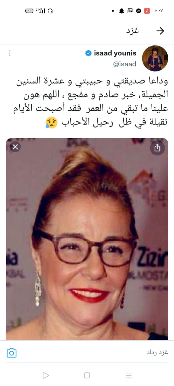 ونعت إسعاد يونس، صديقتها مها أبو عوف وكتبت عبر حسابها بموقع تويتر: وداعا صديقتي وحبيبتي وعشرة السنين الجميلة، خبر صادم ومفجع، اللهم هون علينا ما تبقى من العمر، فقد أصبحت الأيام ثقيلة في ظل رحيل الأحباب.