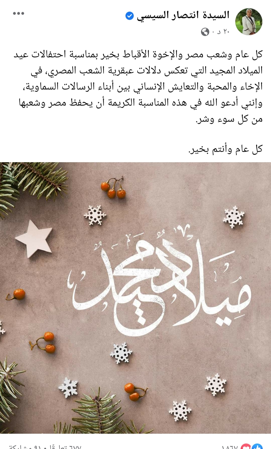 وقالت قرينة الرئيس السيسي، في منشور عبر صفحتها الرسمية بموقع التواصل الاجتماعي فيسبوك، منذ قليل، كل عام وشعب مصر والأخوة الأقباط بخير بمناسبة احتفالات عيد الميلاد المجيد.