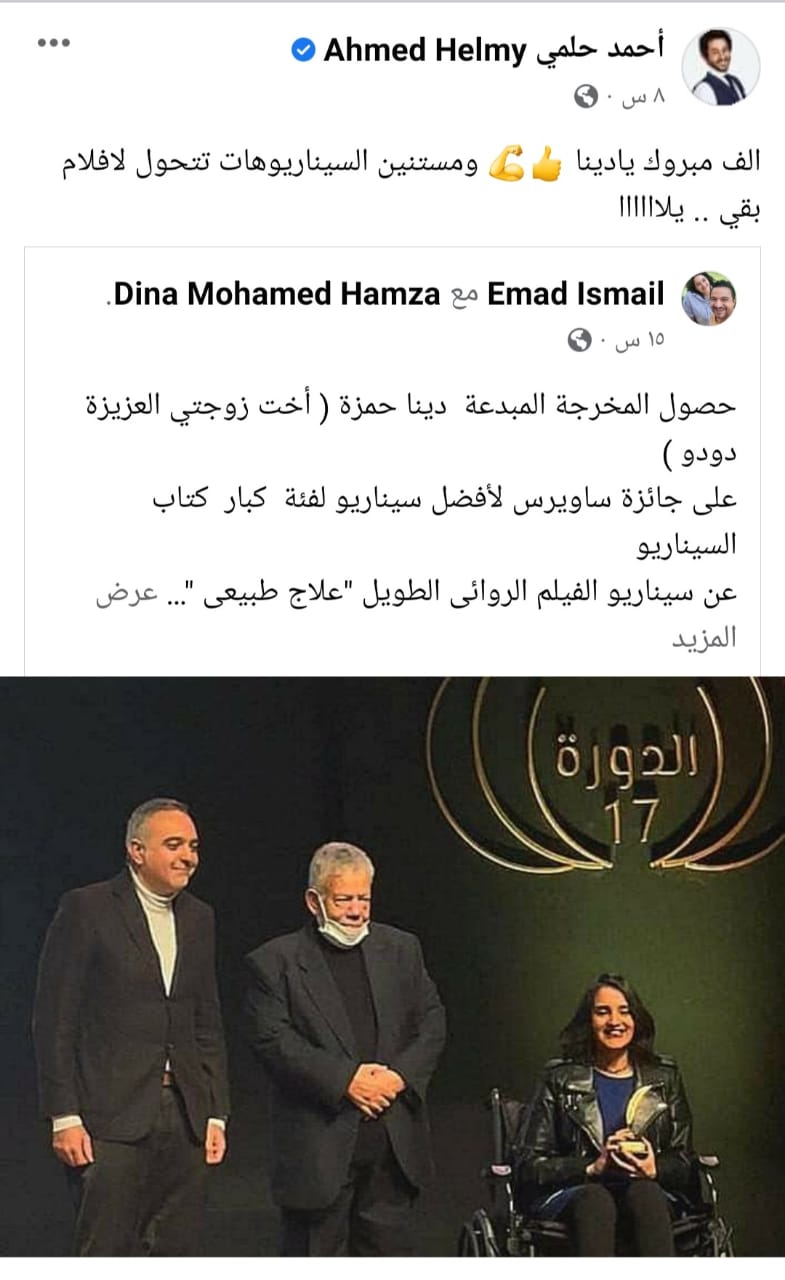 هنأ الفنان أحمد حلمي؛ المخرجة دينا حمزة، بمناسبة حصولها على جائزة ساويرس لأفضل سيناريو، بعنوان علاج طبيعي، وتسلمت الجائزة في حفل أقيم بالمتحف القومي للحضارة المصرية.