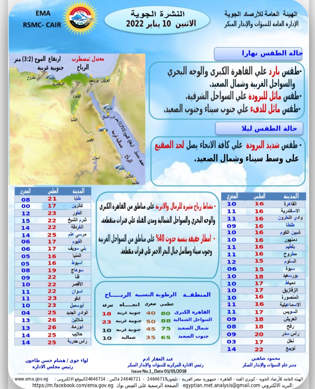 وأصدرت الهيئة نشرتها الجوية الخاصة بحالة الطقس، وقالت إنه من المتوقع أن يسود طقس بارد على القاهرة الكبرى والوجه البحري والسواحل الغربية وشمال الصعيد، مائل للبرودة على السواحل الشرقية، ومائل للدفء على جنوب سيناء وجنوب الصعيد نهارًا.