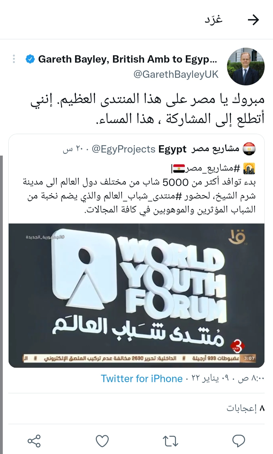 وقال السفير البريطاني عبر حسابه الرسمي بموقع التغريدات القصيرة تويتر: مبروك يا مصر على هذا المنتدى العظيم.. إنني أتطلع إلى المشاركة هذا المساء.
