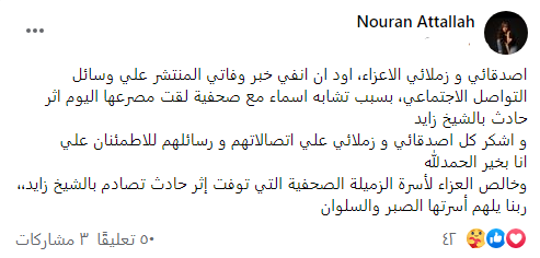 وكتبت نوران عطا الله منشورًا، عبر حسابها الشخصي بموقع التواصل الاجتماعي فيسبوك، لتطمئن متابعيها وأصدقائها عليها، حيث قالت: أصدقائي وزملائي الأعزاء، أود أن أنفي خبر وفاتي المنتشر على وسائل التواصل الاجتماعي، بسبب تشابه أسماء مع صحفية، لقت مصرعها اليوم، إثر حادث بالشيخ زايد.. أنا بخير الحمد لله.