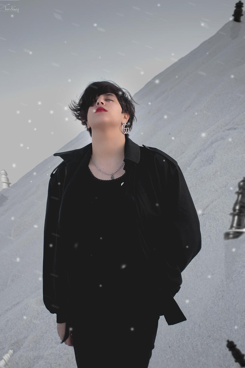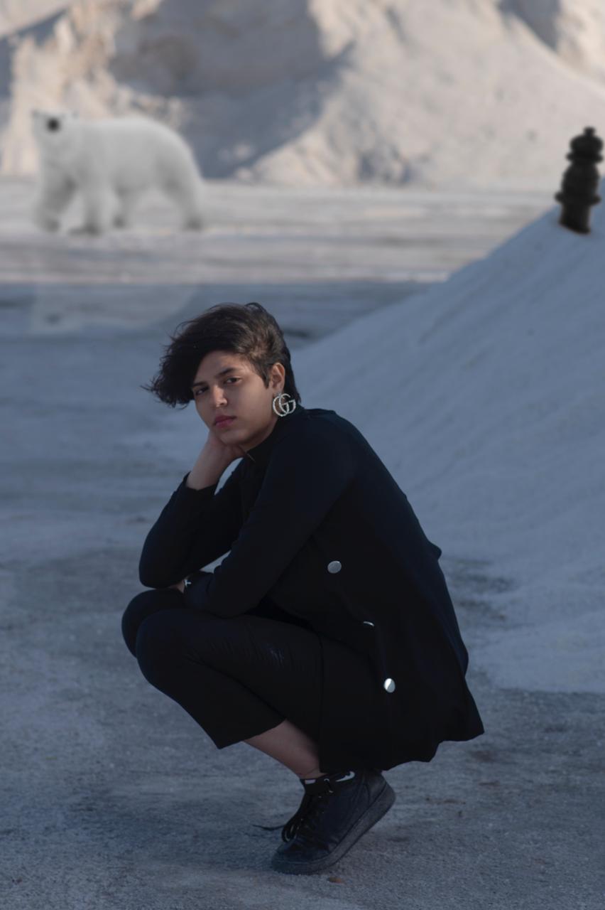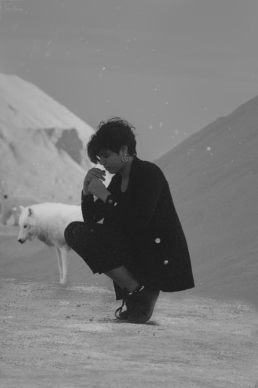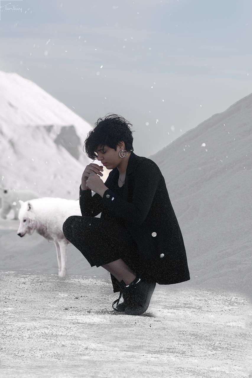 ظهر في الصور التي التقطها؛ فتاة ترتدي الأسود وذئب قطبي وملح مُتطاير يُشبه الثلج، ليتوقع المشاهد، أن الصور في جبال الثلج بدول أوروبا وروسيا.