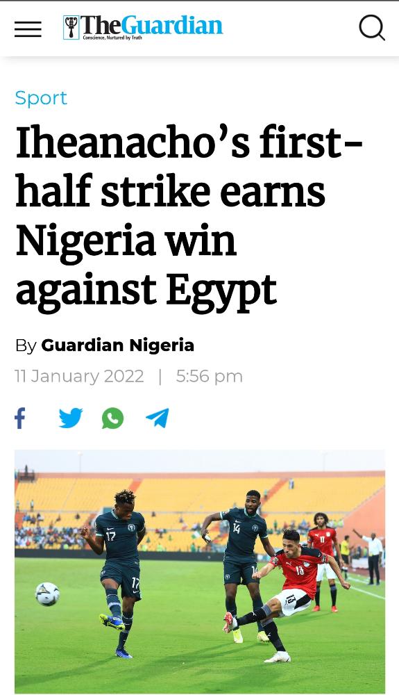يرصد القاهرة 24 لمتابعيه رد فعل الصحافة النيجيرية على فوز منتخب نيجيريا لكرة القدم على منتخب مصر الوطني، في المباراة التي جمعت بينهما، ضمن منافسات الجولة الأولى من دور المجموعات ببطولة كأس الأمم الإفريقية 2021، بعد أن نجح سوبر إيجلز في الفوز بنتيجة 1-0 بهدف سجله كيليتشي إيهيانتشو نجم ليستر سيتي.