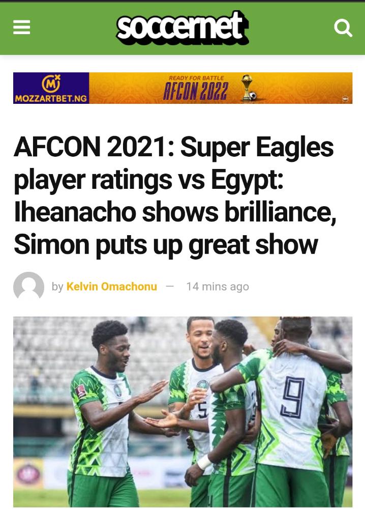 تناولت صحيفة سوكر نت النيجيرية في تقريرها عن المباراة، أن المنتخب النيجيري استلهم الفوز على الفراعنة بذكاء إيهيانتشو، الذي حصل على التقييم الأعلى.