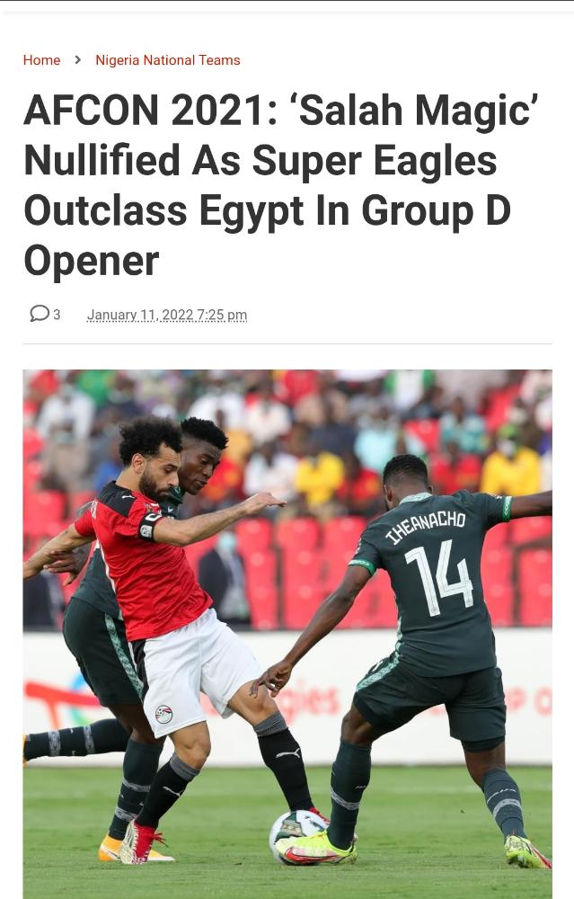 تصدر عنوان، مفعول صلاح السحري يتوقف بمنتخب نيجيريا بافتتاحية المجموعة الرابعة من كأس الأمم الإفريقية، صحيفة complete sport بعد نهاية المباراة.