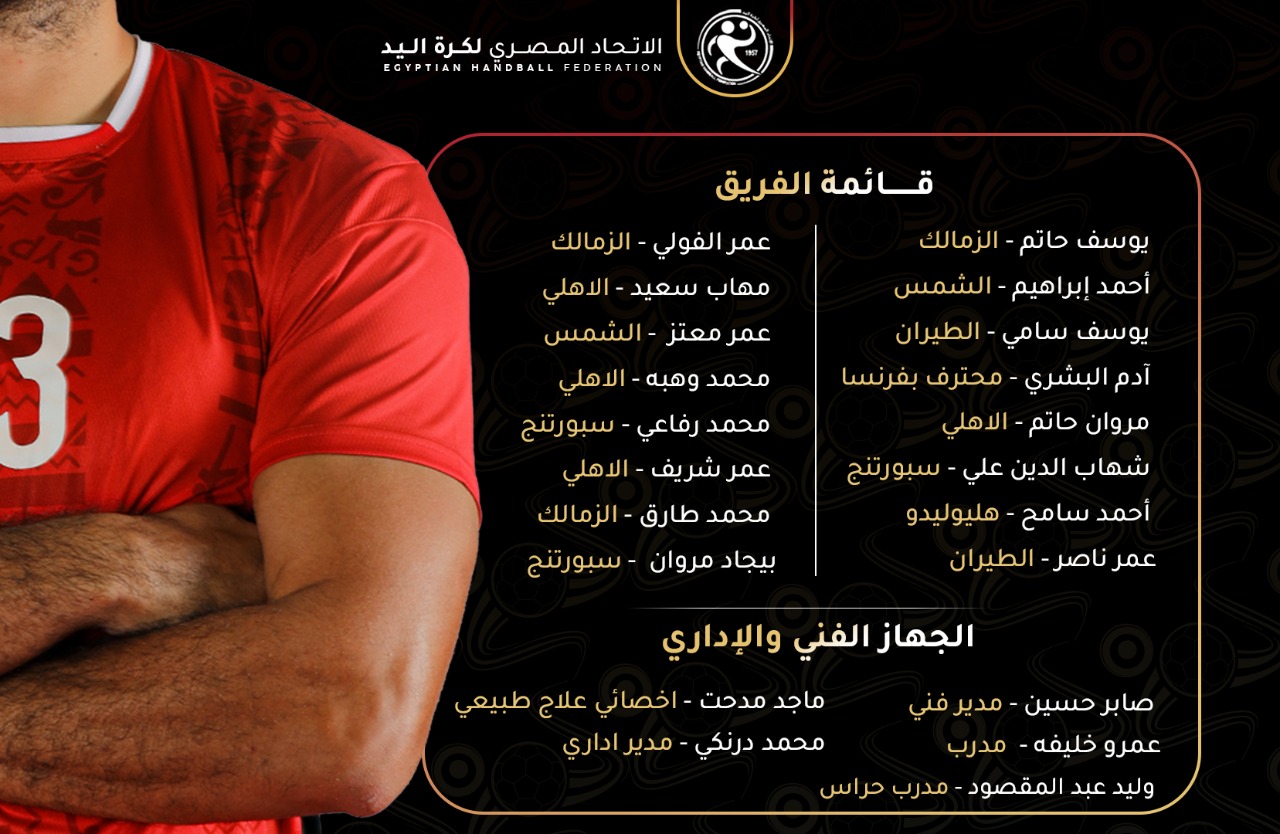 ويقود المنتخب الوطني لكرة اليد صابر حسين مديرا فنيا، عمرو خليفة مدربا عاما، وليد عبدالمقصود مدرب حراس مرمى، محمد درنكي المدير الإداري، ماجد مدحت للعلاج الطبيعي.
