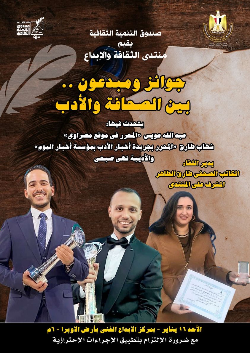 يستضيف مركز الإبداع الفني بساحة الأوبرا، التابع لقطاع صندوق التنمية الثقافية، ندوة جديدة من ملتقي الثقافة والإبداع، والذي ينظمه قطاع الصندوق، وتحمل ندوة هذا الشهر عنوان جوائز ومبدعون بين الصحافة والأدب، وذلك في السادسة مساء الأحد 16 يناير.