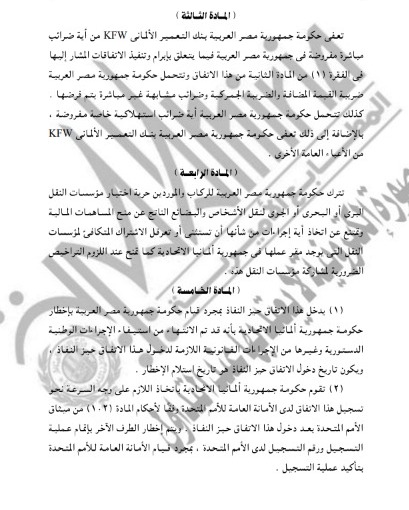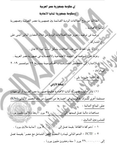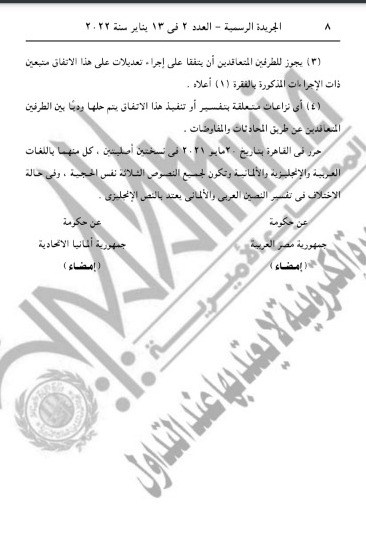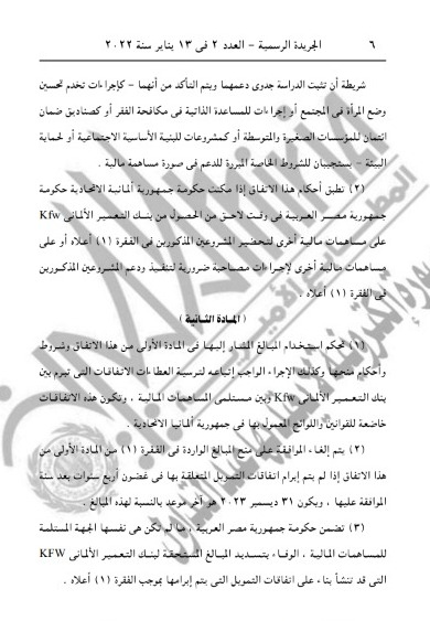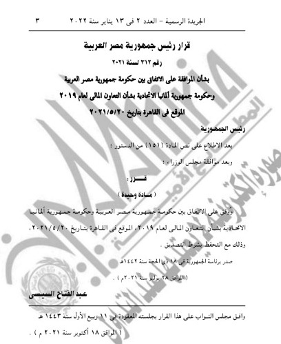 نشرت الجريدة الرسمية في عددها رقم 2 الصادر اليوم 13 يناير 2022، قرار الرئيس عبد الفتاح السيسي رئيس جمهورية مصر العربية رقم 312 لسنة 2021؛ بشأن الموافقة على الاتفاق بين حكومة جمهورية مصر العربية وحكومة جمهورية ألمانيا الاتحادية بشأن التعاون المالي لعام 2019، الموقع في القاهرة بتاريخ 20/5/ 2021.