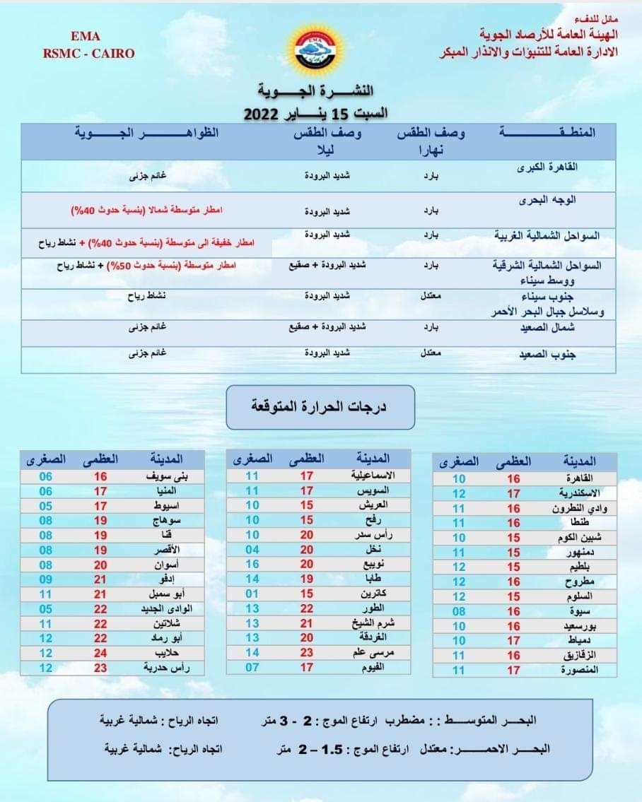 وقالت هيئة الأرصاد في نشرتها الجوية لحالة الطقس غدا، إنه يسود ليلا حالة من الطقس شديد البرودة على كافة الأنحاء يصل إلى حد الصقيع على وسط سيناء وشمال الصعيد.