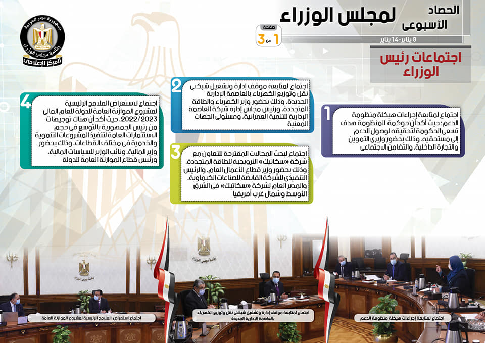 وجاء في التقرير أنه تم عقد عدد من الاجتماعات، تشمل اجتماعًا لمتابعة إجراءات هيكلة منظومة الدعم؛ حيث أكد أن حوكمة المنظومة هدف تسعى الحكومة لتحقيقه لوصول الدعم إلى مستحقيه، وذلك بحضور وزيري التموين والتجارة الداخلية، والتضامن الاجتماعي، بالإضافة إلى اجتماع لمتابعة موقف إدارة وتشغيل شبكتي نقل وتوزيع الكهرباء بالعاصمة الإدارية الجديدة، وذلك بحضور وزير الكهرباء والطاقة المتجددة، ورئيس مجلس إدارة شركة العاصمة الإدارية للتنمية العمرانية، ومسئولي الجهات المعنية، فضلًا عن اجتماع لاستعراض الملامح الرئيسية لمشروع الموازنة العامة للدولة للعام المالي 2022-2023، حيث أكد أن هناك توجيهات من رئيس الجمهورية بالتوسع في حجم الاستثمارات العامة لتنفيذ المشروعات التنموية والخدمية في مختلف القطاعات، وذلك بحضور وزير المالية، ونائب الوزير للسياسات المالية، ورئيس قطاع الموازنة العامة للدولة.