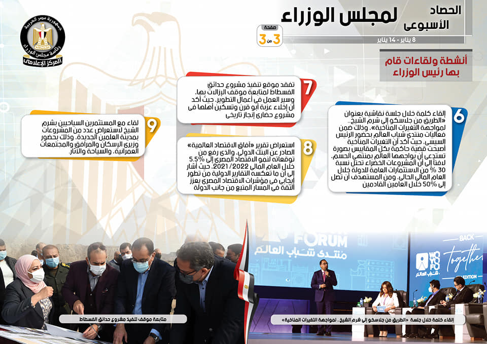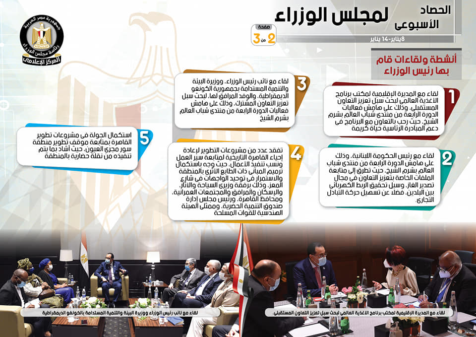 نشر المركز الإعلامي لمجلس الوزراء تقريرا شمل إنفوجرافات، سلط من خلالها الضوء على الحصاد الأسبوعي لمجلس الوزراء، وذلك خلال الفترة من 8 حتى 14 يناير 2022، الذي تضمن عددا من الاجتماعات التي عقدها الدكتور مصطفى مدبولي، رئيس مجلس الوزراء، بالإضافة إلى ما قام به رئيس الوزراء، من أنشطة ولقاءات.