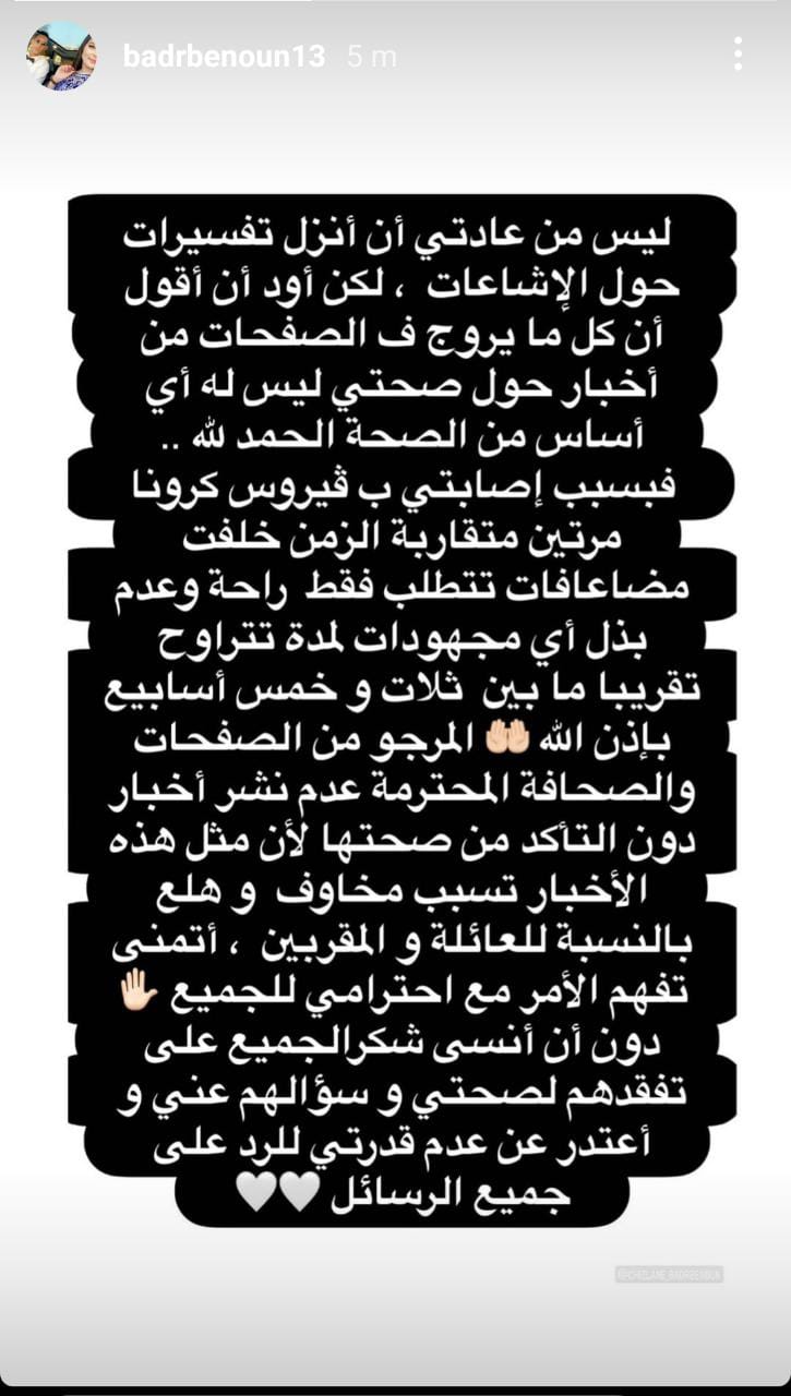 وقال بدر بانون: ليس من عادتي إنى انزل تفسيرات حول الشائعات لكن أود القول إن كل ما يروج في الصفحات حول صحتي ليس له أي أساس من الصحة الحمد لله.