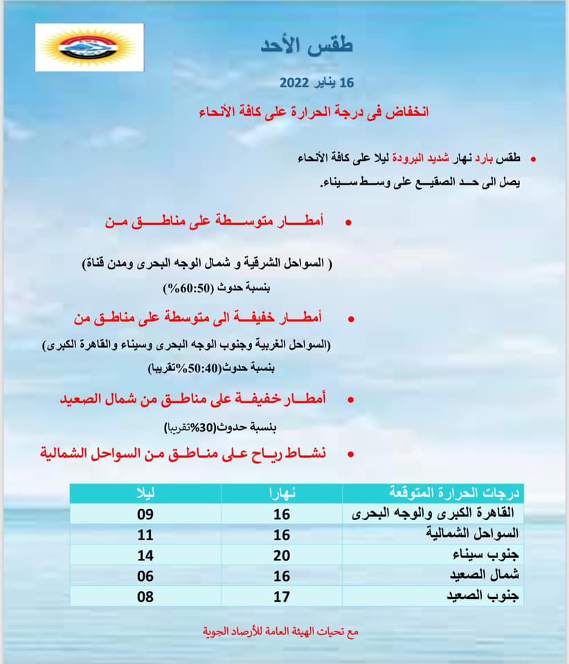 أعلنت الهيئة العاملة للأرصاد في بيان لها منذ قليل عن طقس غد الأحد الموافق 16 يناير 2021.