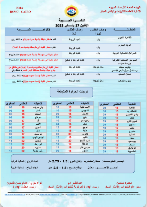 ومتابعة لحالة التقلب الجوي التي تشهدها مصر، كشفت الهيئة العامة للأرصاد الجوية تفاصيل حالة الطقس غدًا الاثنين الموافق 17 يناير الجاري، وبيان درجات الحرارة والظواهر الجوية.