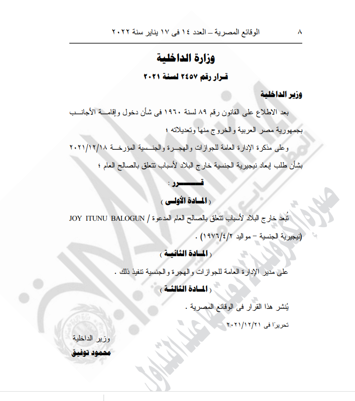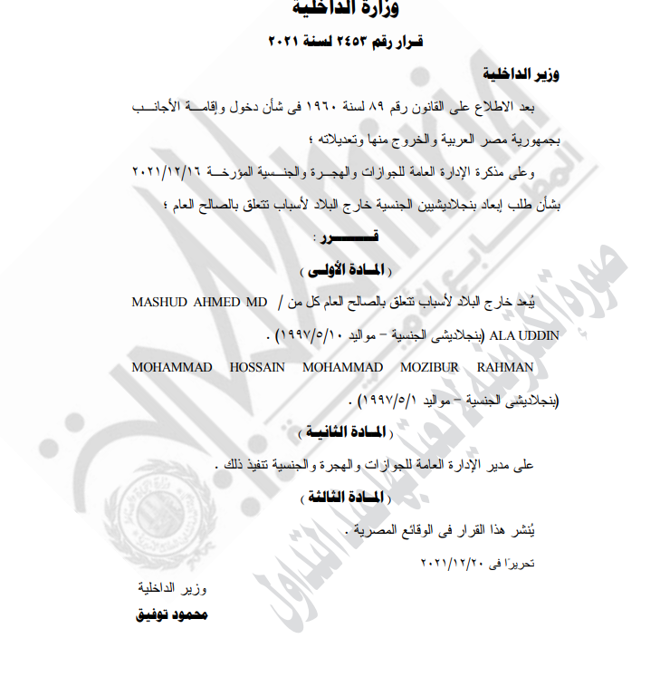 صدر القرار بعد الاطلاع على القانون رقم 26 لسنة 1975 الصادر بشأن الجنسية المصرية، كما نشرت الجريدة قرار بإبعاد 2 من مواطني دولة بنجلاديش، وسيدة نيجيرية لأسباب تتعلق بالصالح العام.