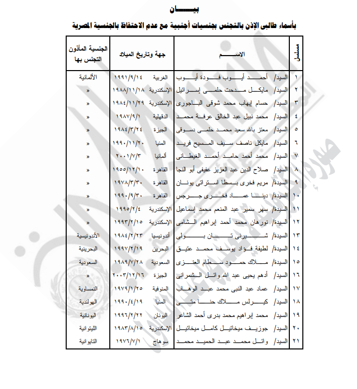 نشرت الجريدة الرسمية، صباح اليوم الاثنين، قرار من وزارة الداخلية، بالإذن لـ 21 شخصا بالتجنس بالجنسية الأجنبية المرفقة مقابل كل اسم في الكشف التالي، مع عدم الاحتفاظ بالجنسية المصرية.