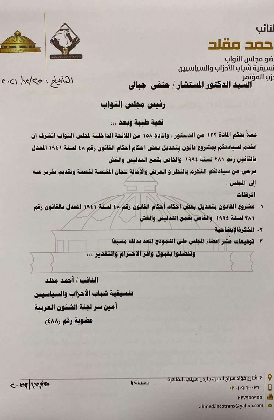 تقدم النائب أحمد مقلد عضو مجلس النواب، عن تنسيقية شباب الأحزاب والسياسيين، وأمين سر لجنة الشؤون العربية بمجلس النواب، بمشروع قانون بتعديل بعض أحكام القانون رقم 48 لسنة 1941 المعدل بالقانون رقم 281 لسنة 1994، والخاص بقمع التدليس والغش.