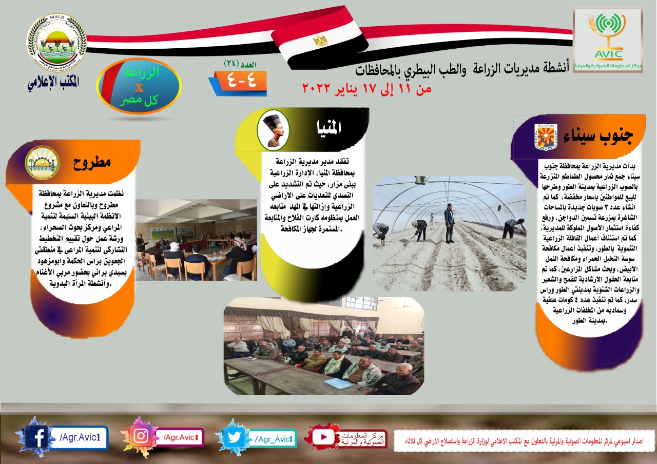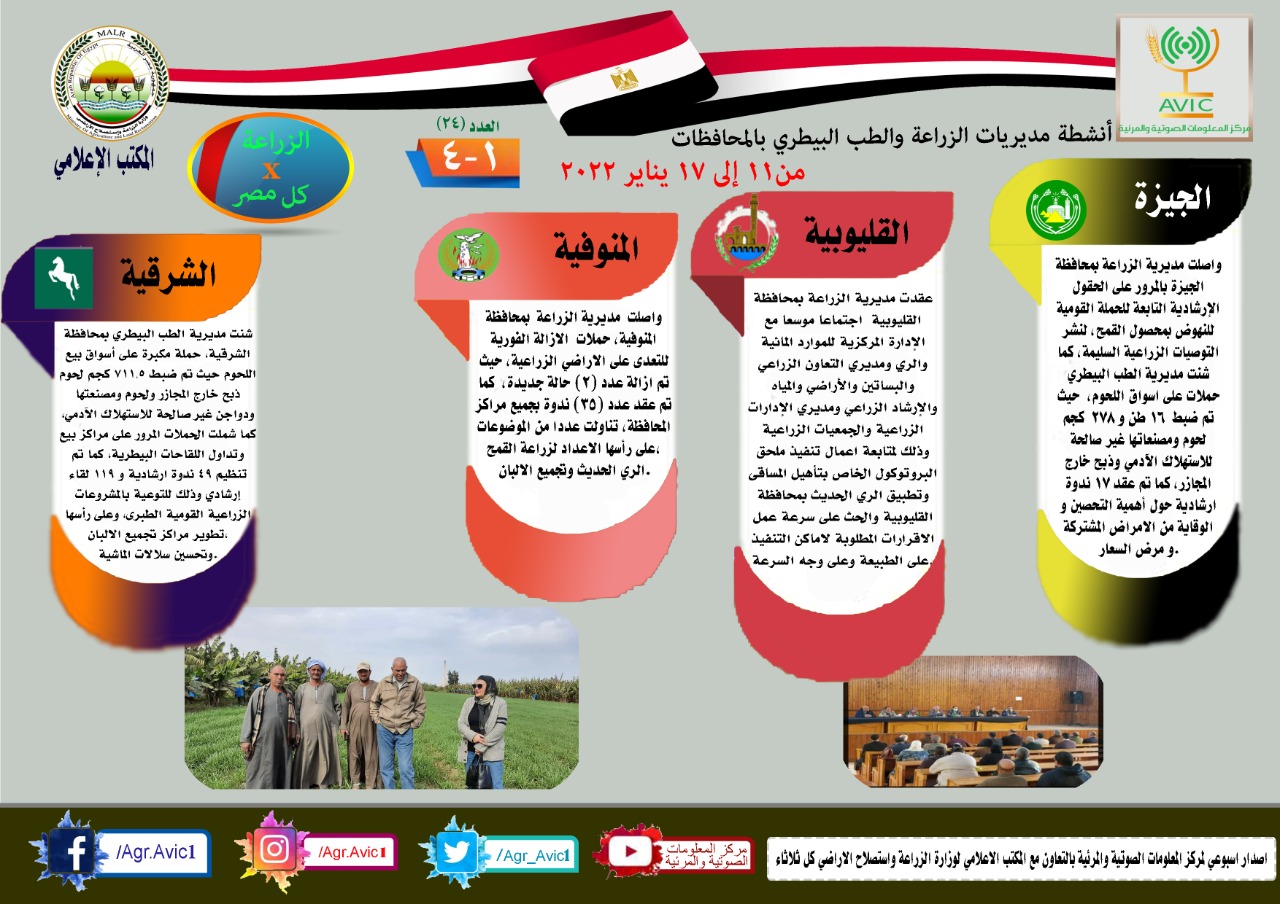 ويوضح الإنفوجراف الجهود والأنشطة التي تقوم بها مديريات الزراعة والطب البيطري بمحافظات الجمهورية خلال الفترة من 11 إلى 17 يناير الجاري الجاري.