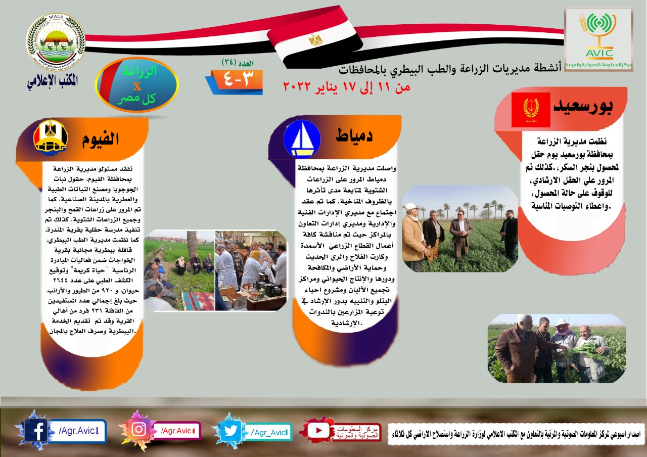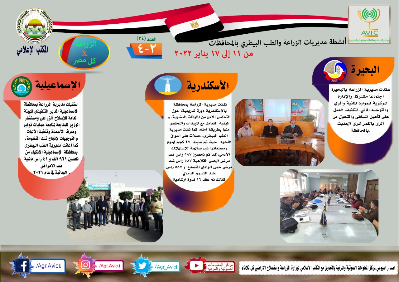 واستقبلت مديرية الزراعة بمحافظة الإسماعيلية المدير التنفيذي للهيئة العامة للإصلاح الزراعي ومستشار الوزير للمتابعة لمتابعة عمليات توفير وصرف الأسمدة وتنفيذ الآليات والتوجيهات لإنجاح تلك المنظومة، كما أعلنت مديرية الطب البيطري بمحافظة الإسماعيلية الانتهاء من تحصين 961 ألفا و41 رأس ماشية ضد الأمراض الوبائية في عام 2021، كذلك عقدت مديرية الزراعة بالبحيرة اجتماعا مشتركا، والإدارة المركزية للموارد المائية والري والتوجيه المائي، لتكثيف العمل على تأهيل المساقى والتحول من الري بالغمر للري الحديث بالمحافظة.