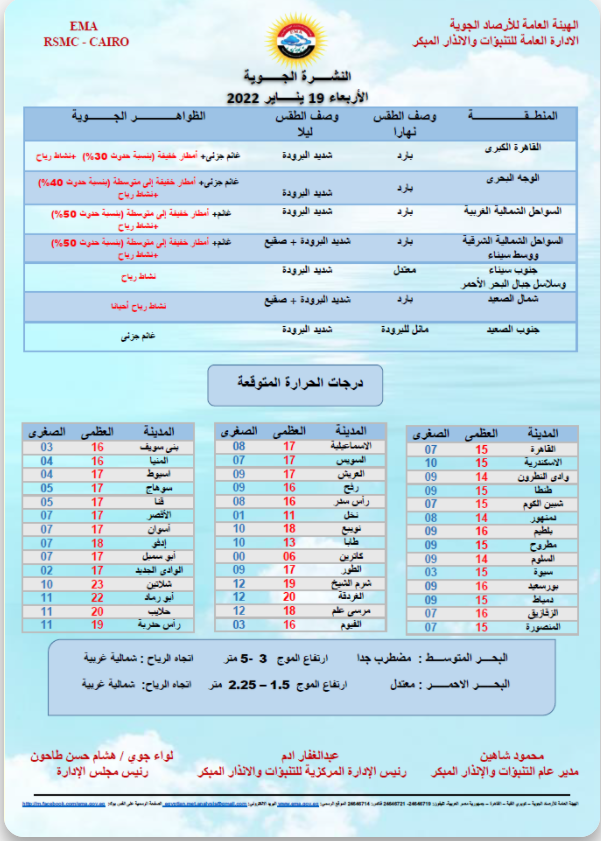 كما يستمر انخفاض درجات الحرارة غدا الأربعاء على كافة الأنحاء، وتسجل درجات الحرارة العظمى في القاهرة 15 درجة وتصل إلى 7 درجات ليلًا، وتتساقط الثلوج على مرتفعات سانت كاترين بجنوب سيناء نتيجة الانخفاض الشديد في الحرارة التي تصل إلى تحت الصفر، وتسجل الحرارة ليلًا على شمال الصعيد ما بين 3 إلى 5 درجات مئوية.