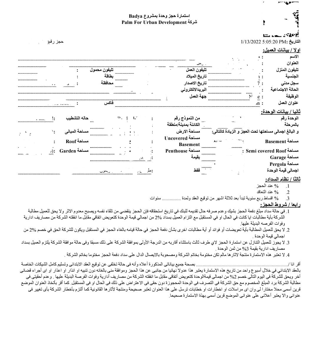 وقالوا إن العميل يقر بصحة جميع بياناته المذكورة، وأنه في حالة تخلفه عن توقيع العقد الابتدائي وتسليم كامل الشيكات الخاصة بالعقد الابتدائي في خلال أسبوع واحد من تاريخ توقيعه على الاستمارة يعتبر هذا عدولا نهائيا من الحجز وموافقة منه بإلغائه دون تنبيه أو إنذار أو أعذار أو أي إجراء قضائي آخر، ويحق للشركة في اليوم التالي خصم 2% من إجمالي قيمة الوحدة كتعويض اتفاقي مقابل ما أنفقته الشركة من مصاريف إدارية وفوات الفرصة البديلة عليها، مع عدم أحقيته في مطالبة الشركة برد المبلغ المخصوم، مع حق الشركة في التصرف في الوحدة المحجوزة دون حق في الاعتراض على ذلك في الحال أو في المستقبل.