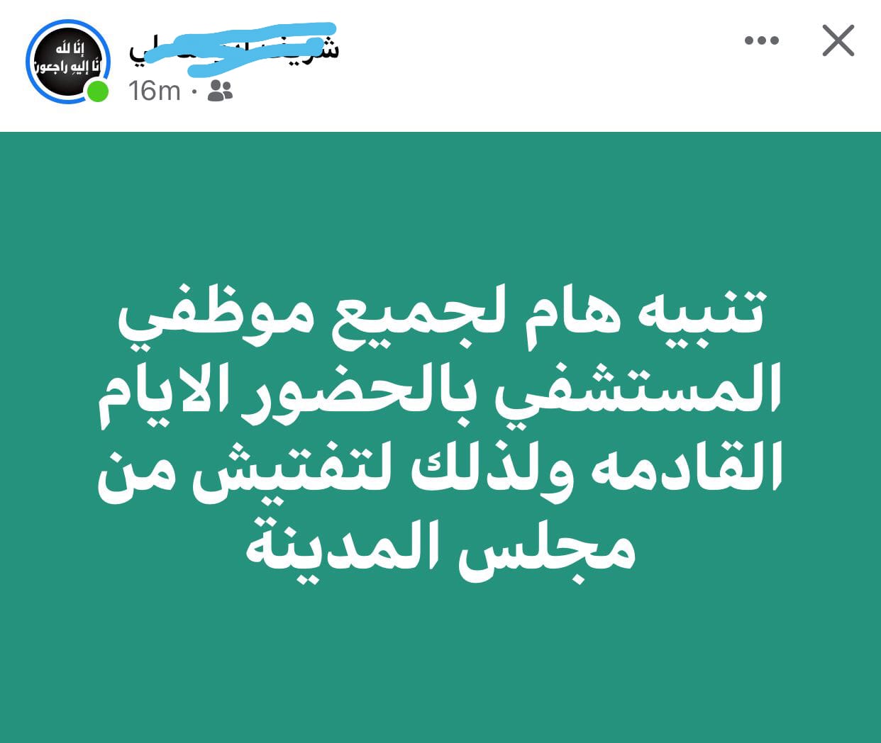 وكتب رئيس شئون العاملين بمستشفى فرشوط عبر حسابه الشخصي على موقع التواصل الاجتماعي فيس بوك: تنبيه هام لجميع موظفي المستشفى بالحضور الأيام القادمة وذلك لتفتيش من مجلس المدينة.