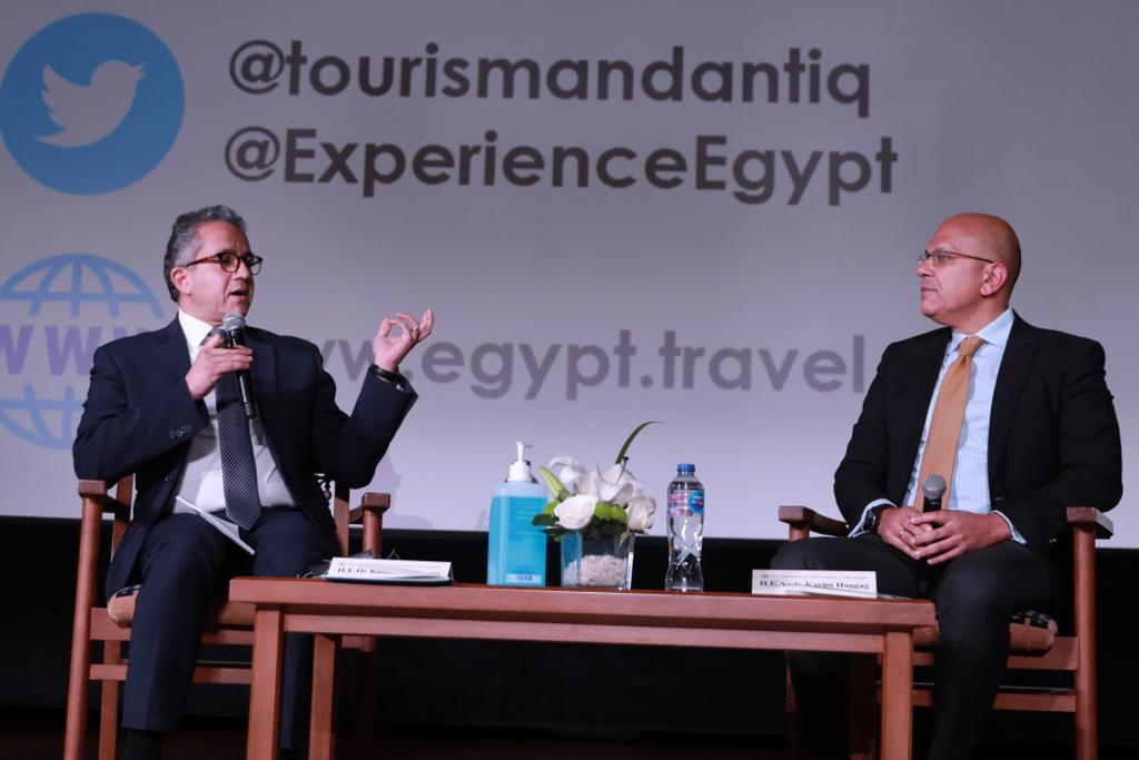 واستهل حديثه بإطلاع الحاضرين على الأماكن السياحية والأثرية على مستوى الجمهورية والمواقع الأثرية بمصر المدرجة على قائمة التراث العالمي، بالإضافة إلى إطلاعهم على آخر أهم الاكتشافات الأثرية، ومنها الكشف مقبرة واحتي، الرائعة الجمال في سقارة، وتوابيت سقارة التي وصل عددها إلى أكثر من 150 تابوت وغيرها من اكتشافات هامة بالمنيا والأقصر والقاهرة والجيزة وغيرها.