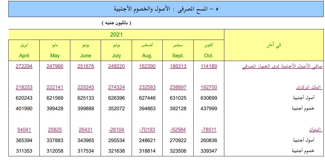 ووفقا لأحدث تقرير للبنك المركزي، فقد تراجع بند الأصول الأجنبية إلى 630.7 مليار جنيه في أكتوبر2021 مقابل 631 مليار جنيه في سبتمبر 2021 بنحو 300 مليون جنيه.