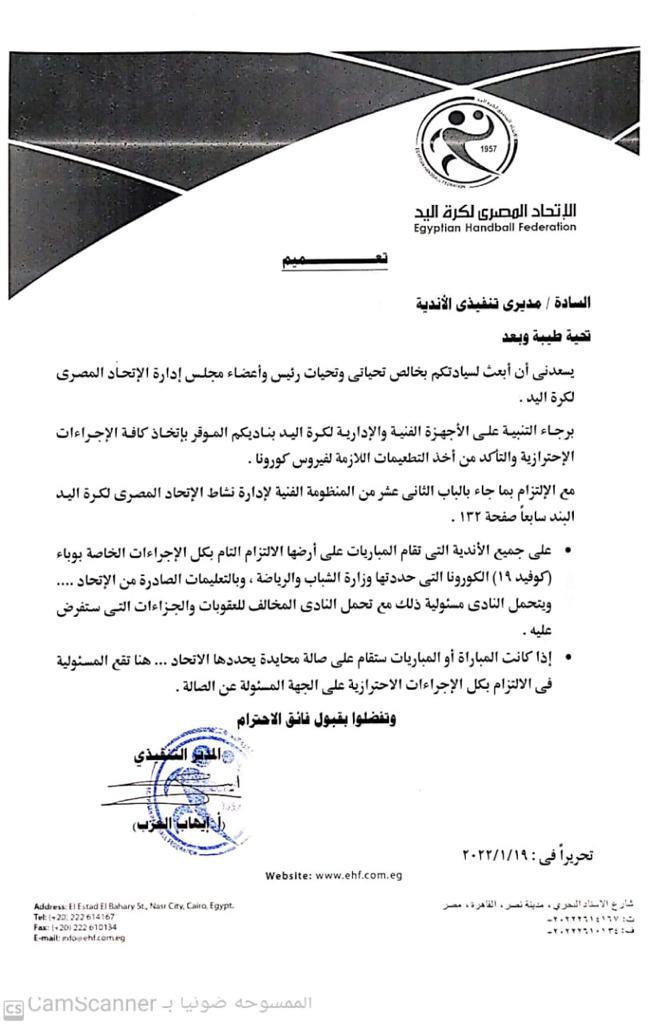شدد الاتحاد المصري لكرة اليد في خطاب موجه إلى الأندية المشاركة في البطولات التي ينظمها الاتحاد، على الالتزام بالإجراءات الاحترازية لتجنب انتشار فيروس كورونا.