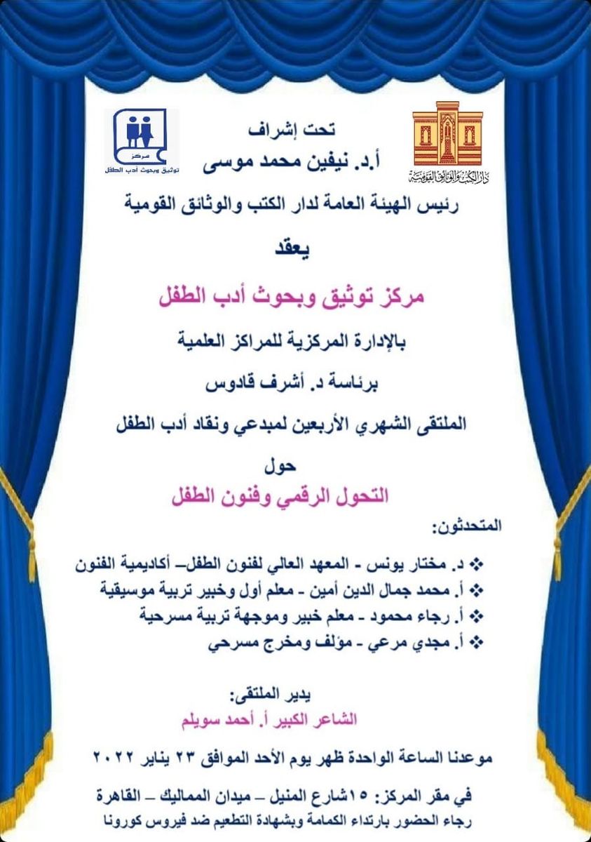 يعقد مركز توثيق وبحوث أدب الطفل بالإدارة المركزية للمراكز العلمية برئاسة الدكتور أشرف قادوس الملتقى الشهري الأربعين لمبدعي ونقاد أدب الطفل حول التحول الرقمي وفنون الطفل، وذلك تحت إشراف الدكتورة نيفين محمد موسى رئيس الهيئة العامة لدار الكتب والوثائق القومية.