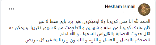 وكتب هشام إسماعيل حقيقة الأمر، عبر حسابه الشخصي على موقع التواصل الاجتماعي فيسبوك، قائلًا: الحمد لله أنا مش كورونا ولا أوميكرون هو برد بايخ فقط لا غير.. كان عندي كورونا من سنة وشهرين واتطعمت من 5 شهور تقريبًا ويمكن ده قلل حدوث الإصابة بالفيروس السخيف والله أعلم.. ننصحكم بالبصل والعسل والتوم والليمون وربنا يشفي كل مريض.